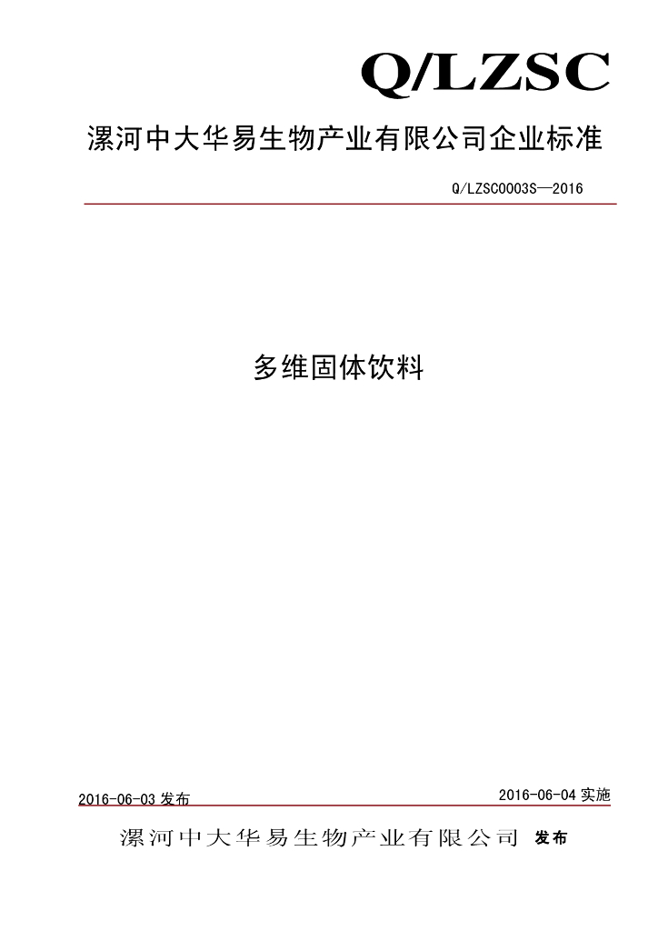 Q/LZSC 0003S-2016 漯河中大华易生物产业有限公司 多维固体饮料