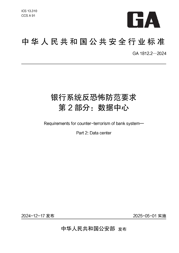 GA 1812.2-2024 银行系统反恐怖防范要求 第2部分:数据中心