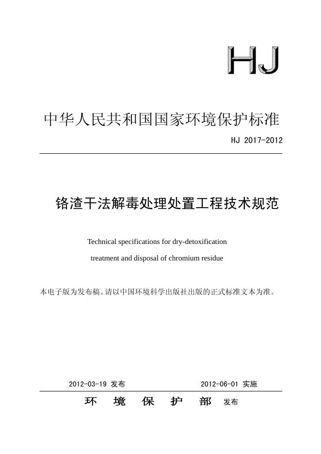HJ 2017-2012 铬渣干法解毒处理处置工程技术规范