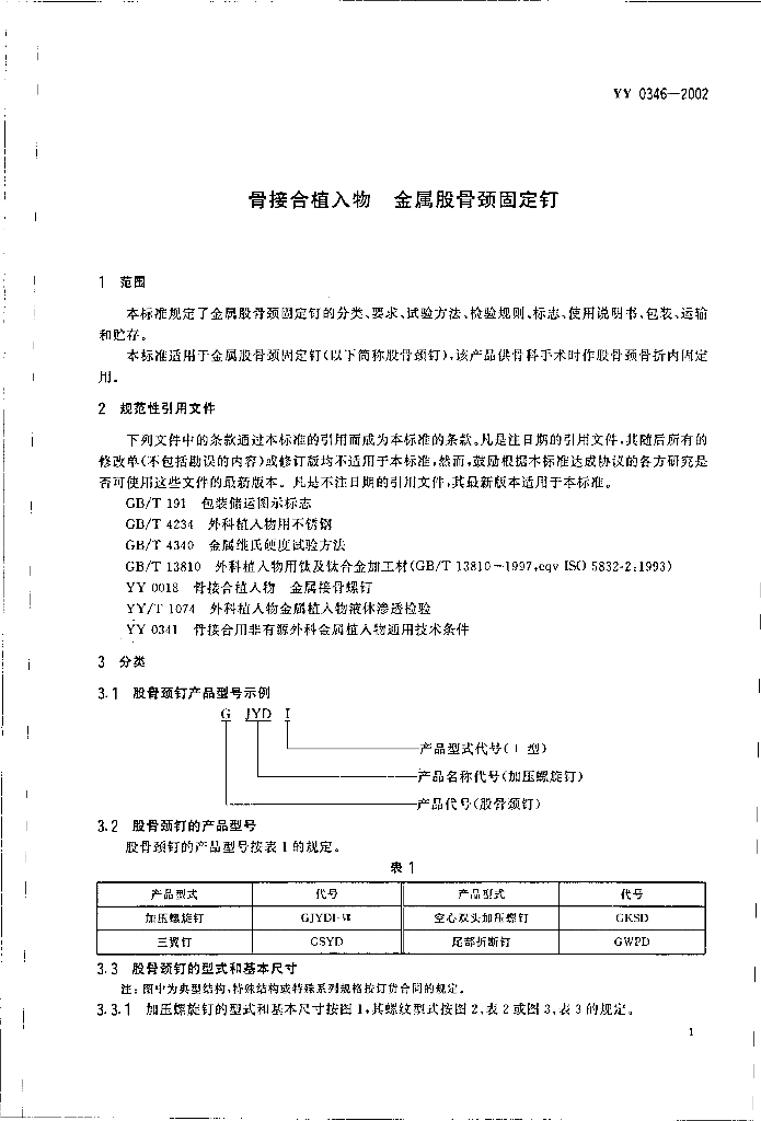 YY 0346-2002 骨接合植入物金属股骨颈固定钉