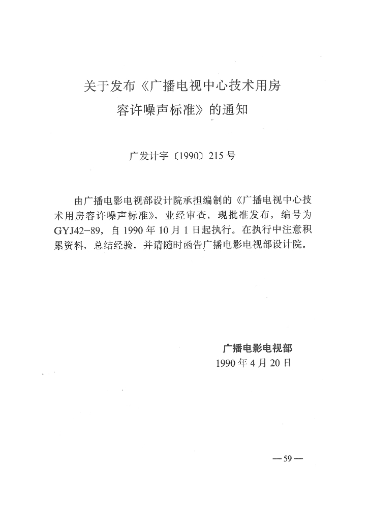 GYJ 42-1989 广播电视中心技术用房容许噪声标准