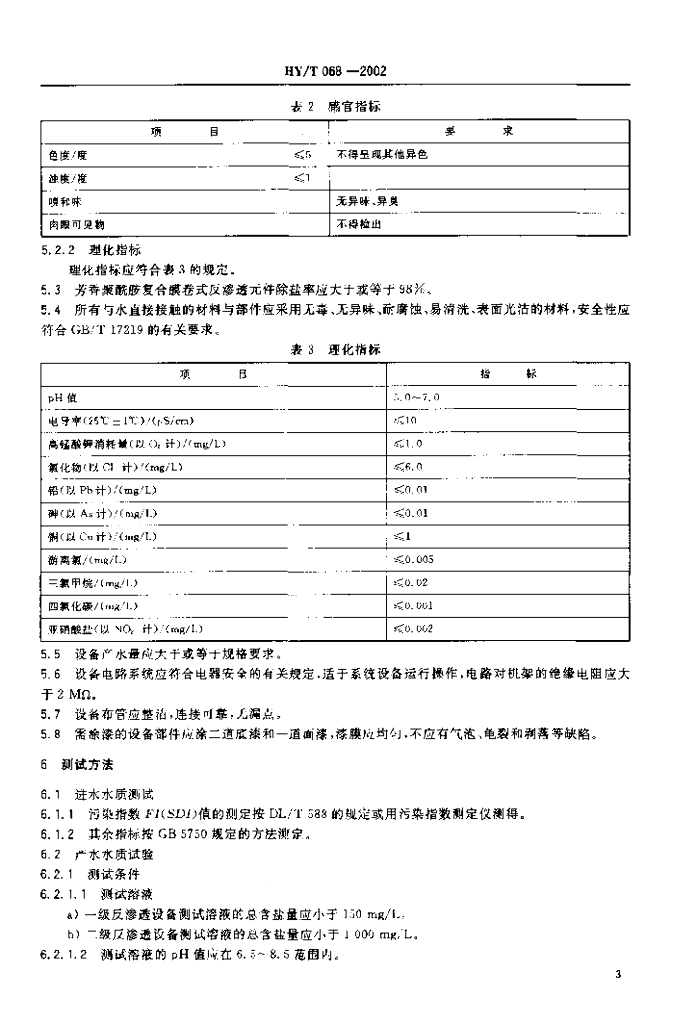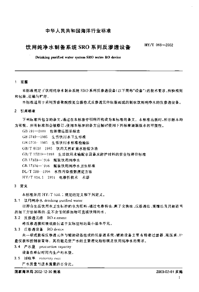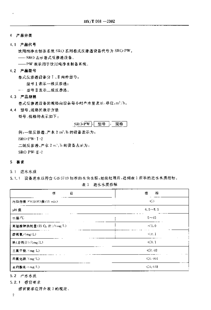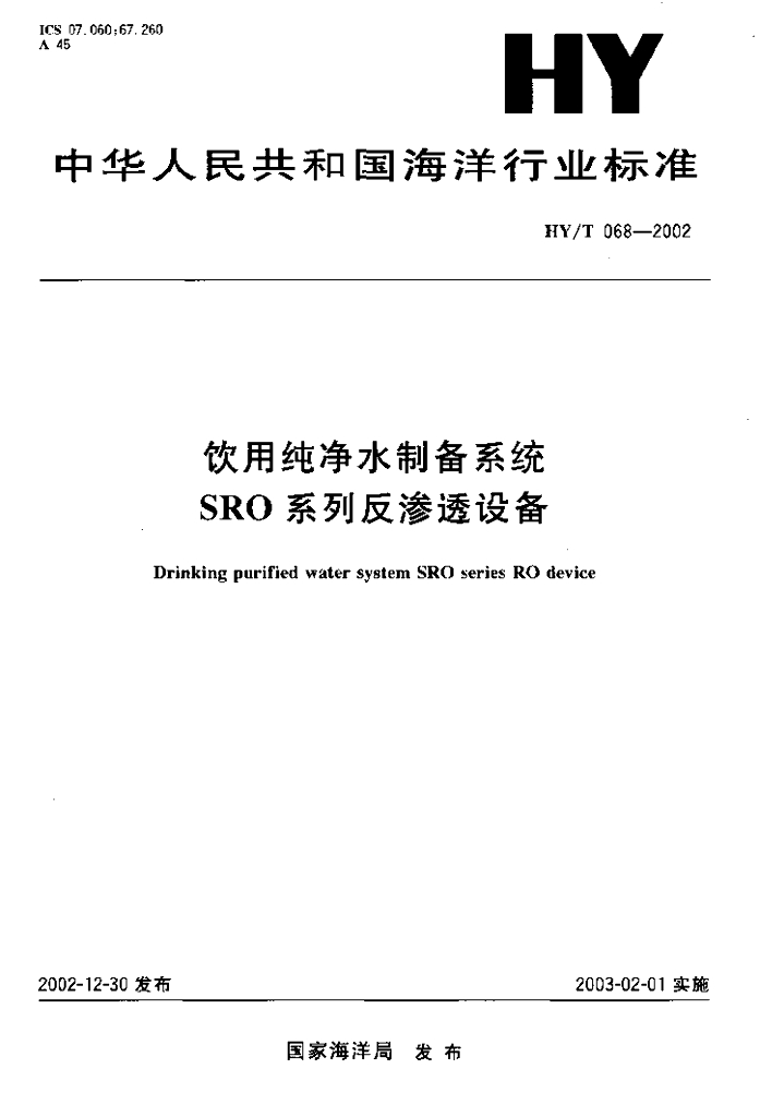 HY/T 068-2002 饮用纯净水制备系统SRO系列反渗透设备