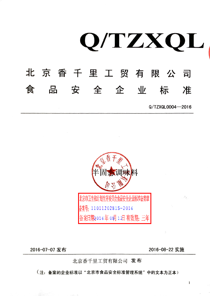 Q/TZXQL 0004-2016 北京香千里工贸有限公司 半固态调味料