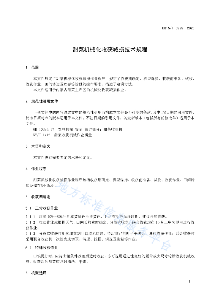 DB15/T 3925-2025 甜菜机械化收获减损技术规程