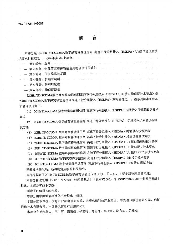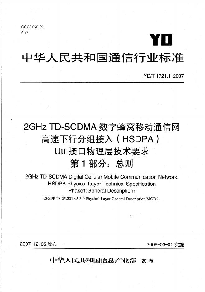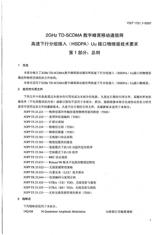 YD/T 1721.1-2007 2GHz TD-SCDMA数字蜂窝移动通信网 高速下行分组接入(HSDPA)Uu接口物理层技术要求 第1部分:总则