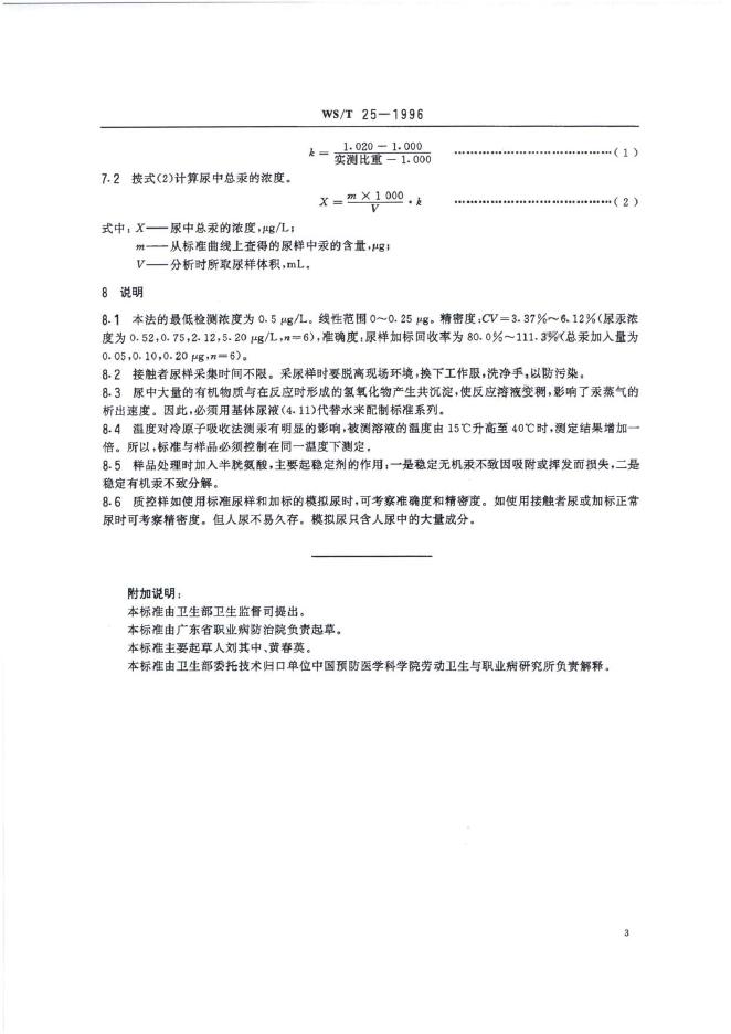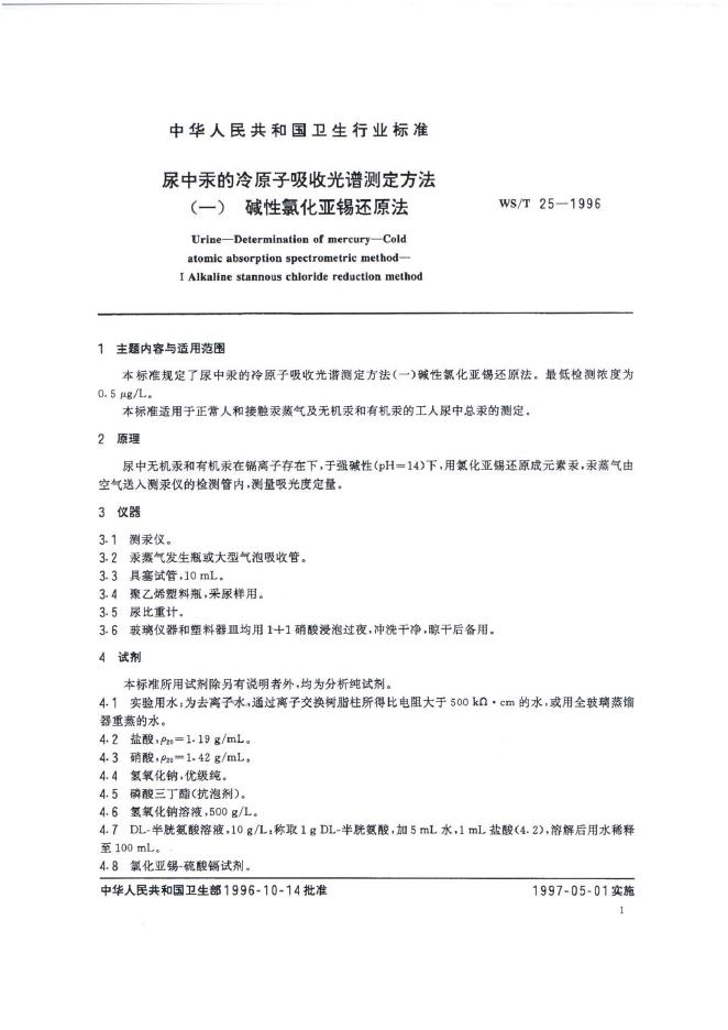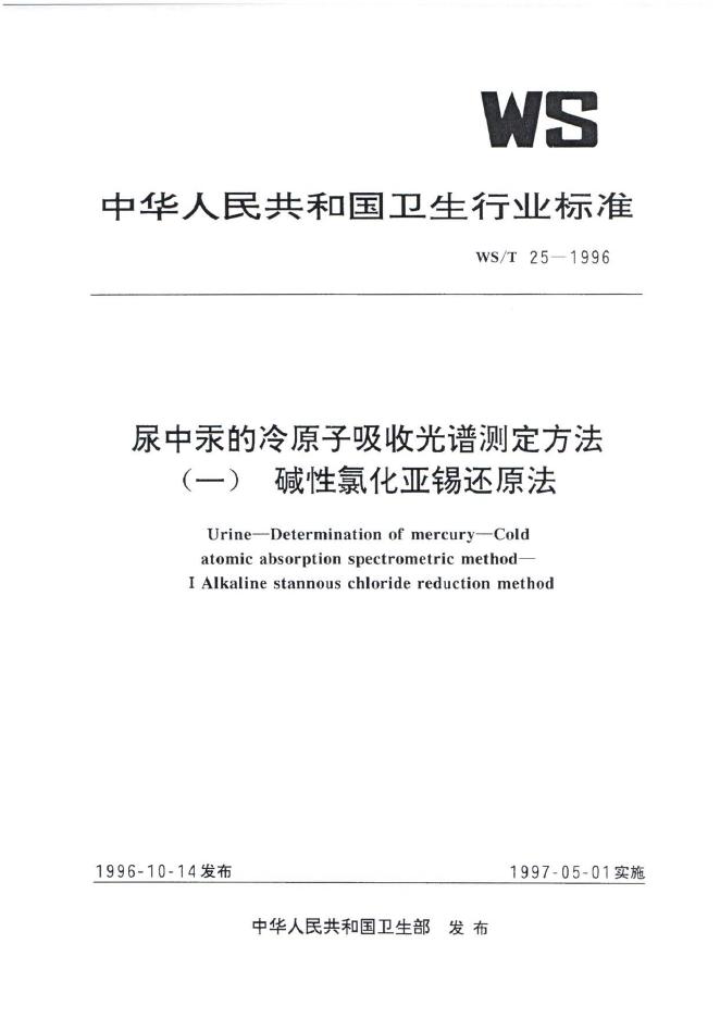 WS/T 25-1996 尿中汞的冷原子吸收光谱测定方法(一)碱性氯化亚锡还原法
