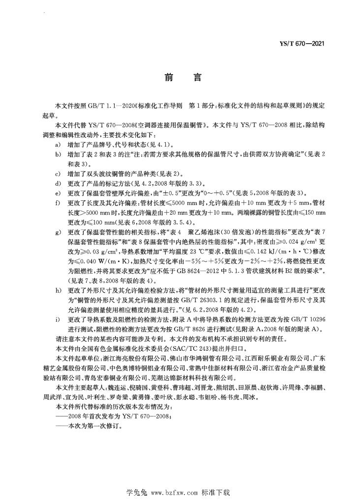 浙江海亮股份有限公司、佛山市华鸿铜管有限公司、江西耐乐铜业有限公司、广东精艺金属股份有限公司、中色奥博特铜铝业有限公司、常熟中佳新材料有限公司、浙江省冶金产品质量检验站有限公司、青岛宏泰铜业有限公司、芜湖达锦新材料科技有限公司