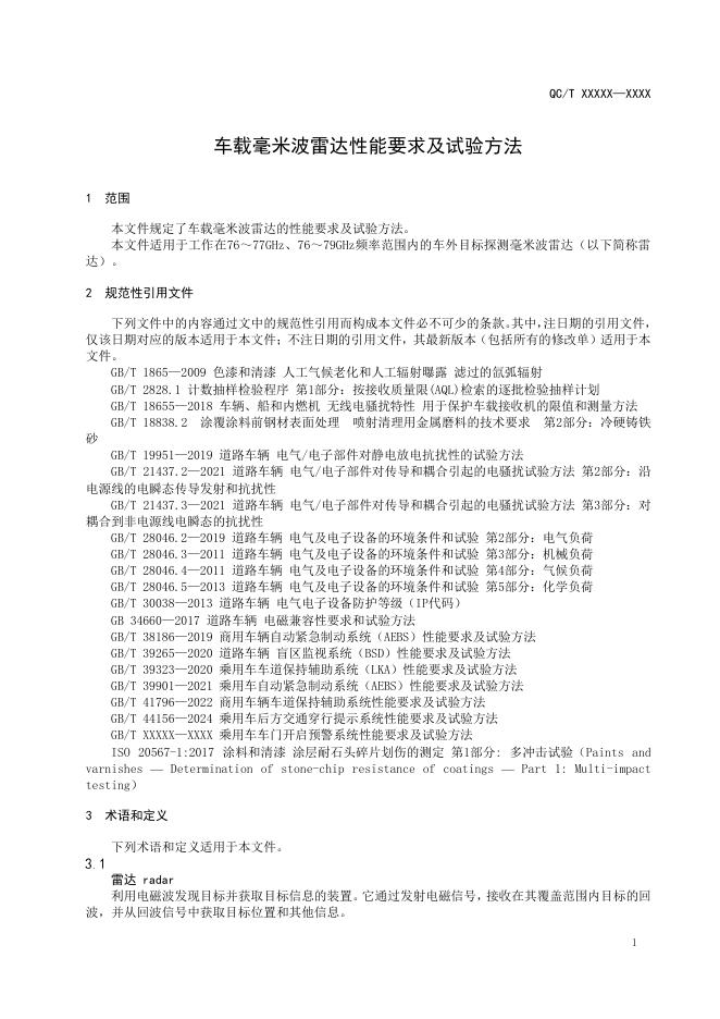 QC/T 1235-2025 车载毫米波雷达性能要求及试验方法