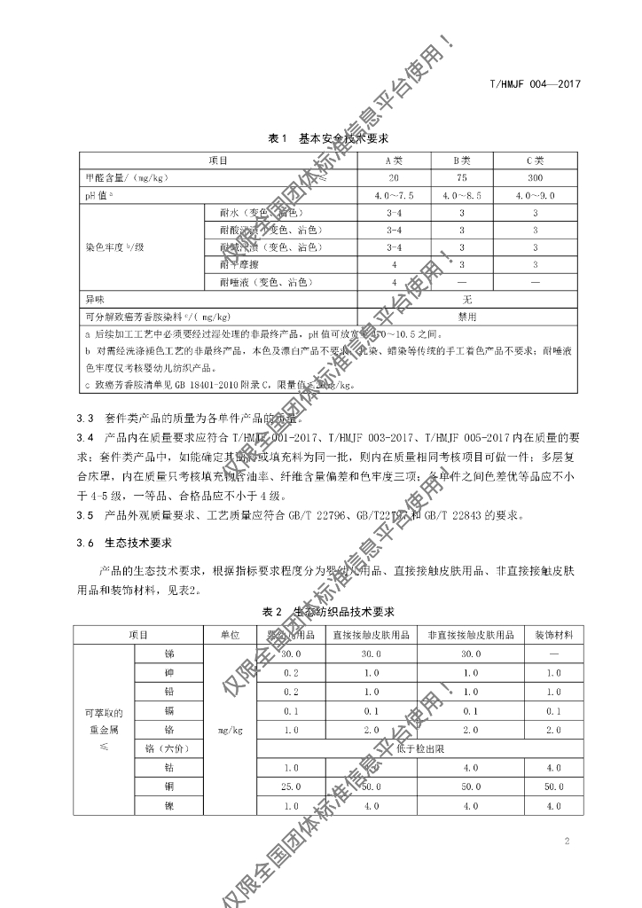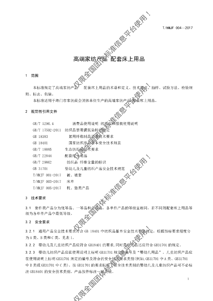 T/HMJF 004-2017 高端家纺产品 配套床上用品