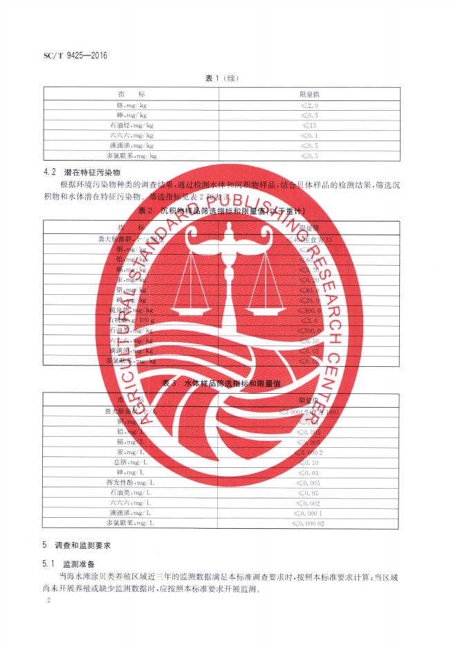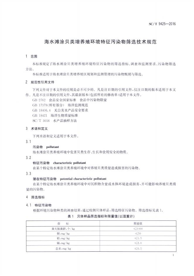 SC/T 9425-2016 海水滩涂贝类增养殖环境特征污染物筛选技术规范