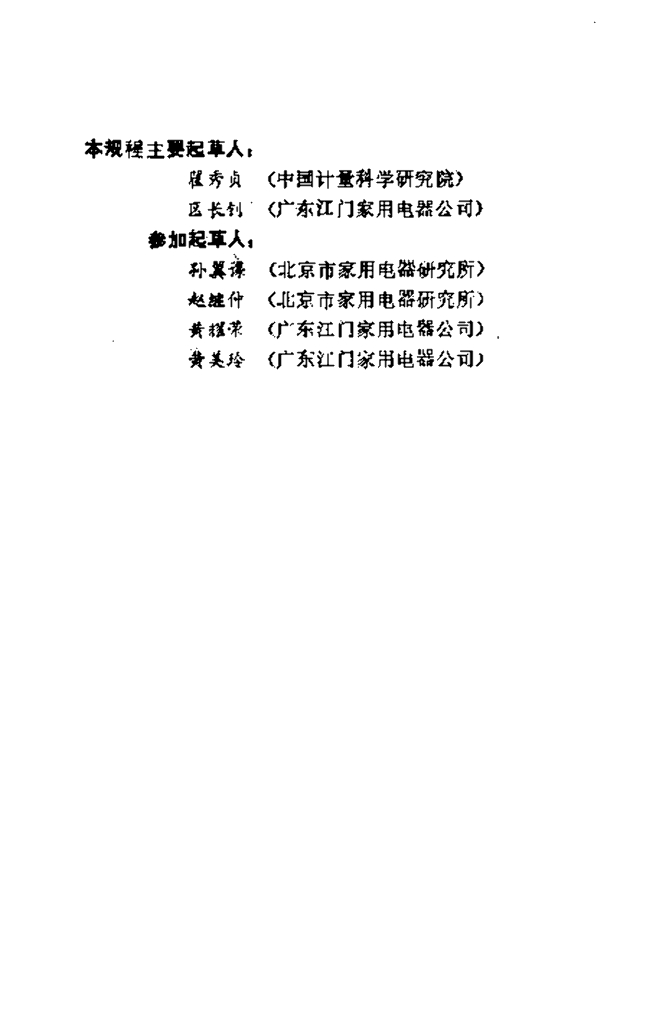 翟秀贞(中国计量科学研究院)、区长钊(广东江门家用电器公司)、孙翼谋(北京市家用电器研究所)、赵继仲(北京市家用电器研究所)、黄耀荣(广东江门家用电器公司)、黄美玲(广东江门家用电器公司)