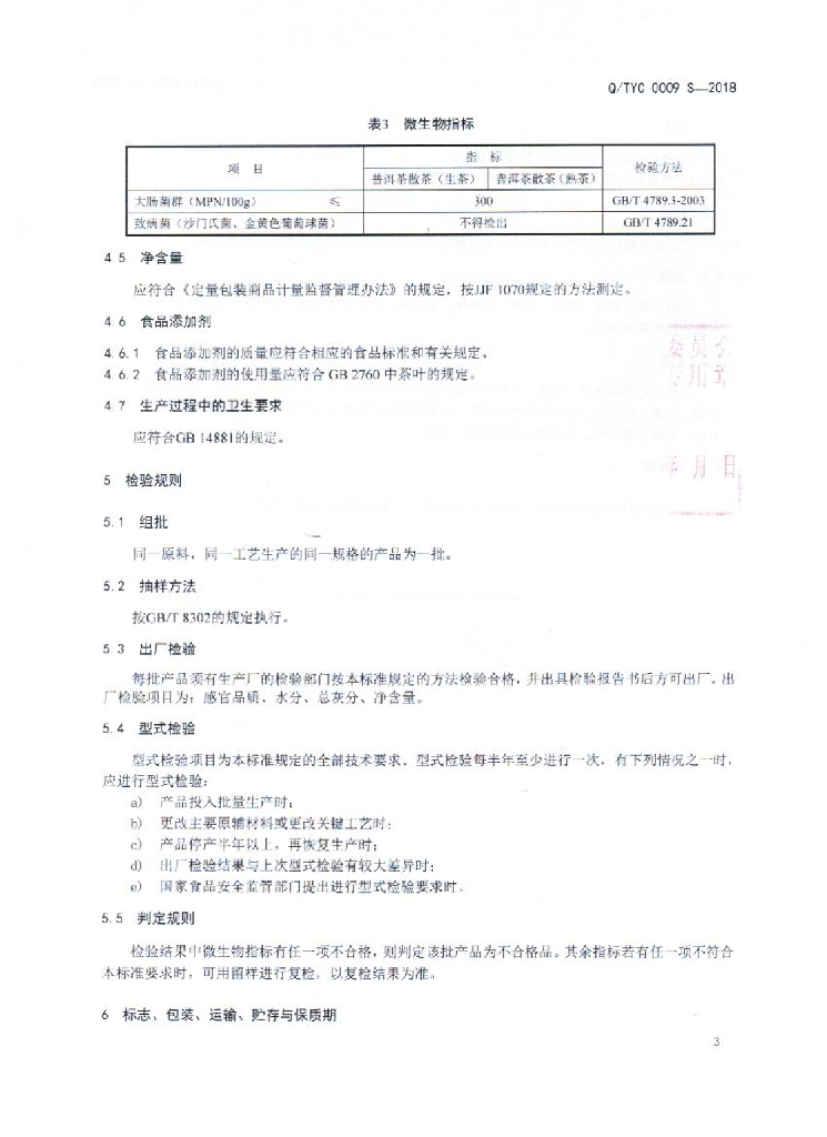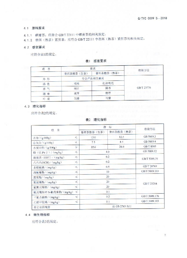 Q/TYC 0009S-2018 普洱茶散茶