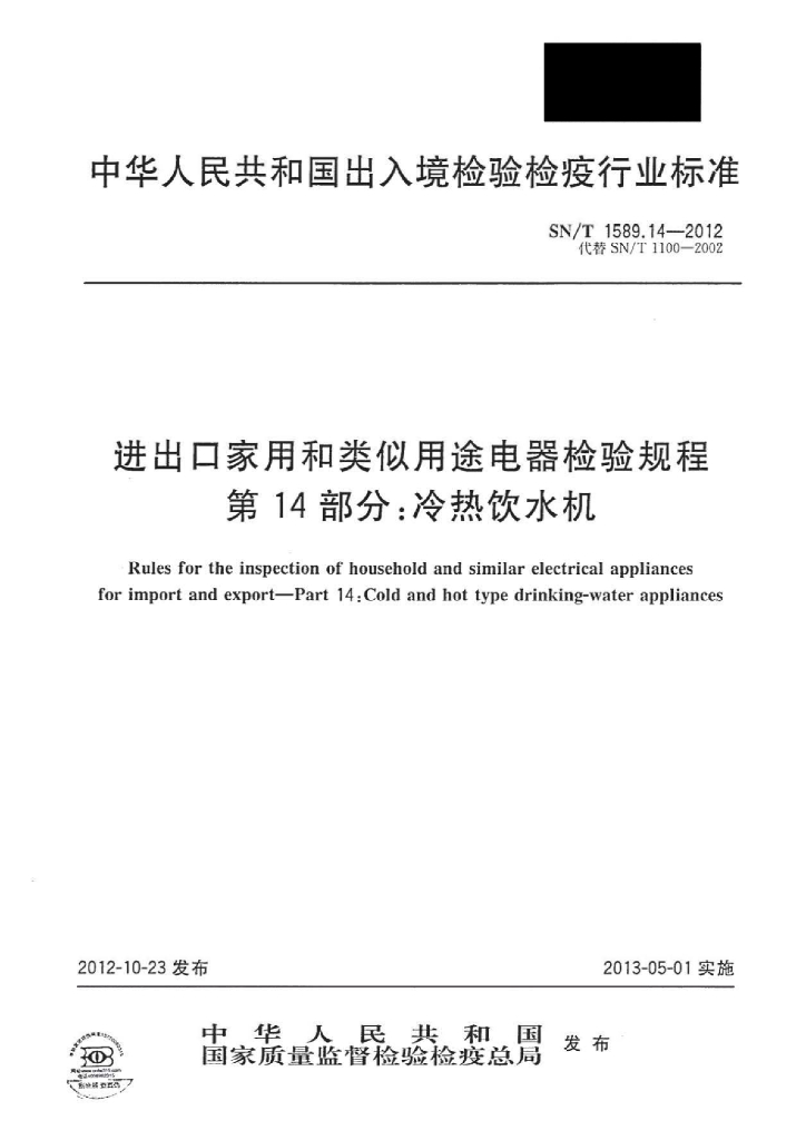 SN/T 1589.14-2012 进出口家用和类似用途电器检验规程 第14部分:冷热饮水机