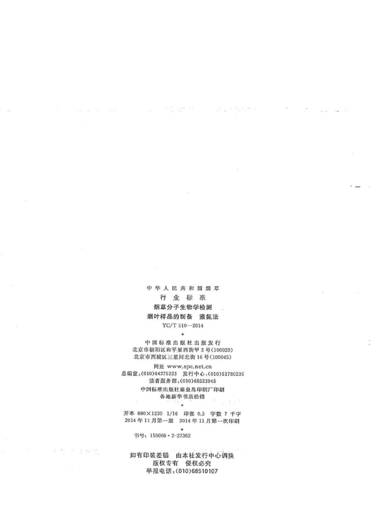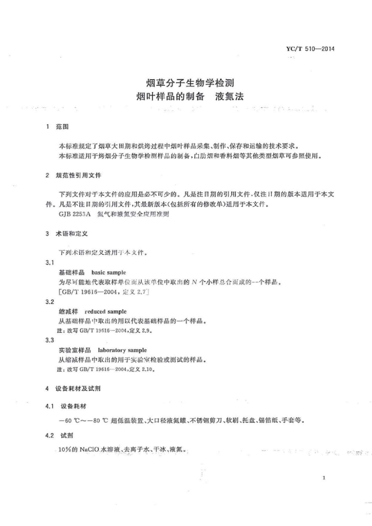YC/T 510-2014 烟草分子生物学检测烟叶样品的制备液氮法