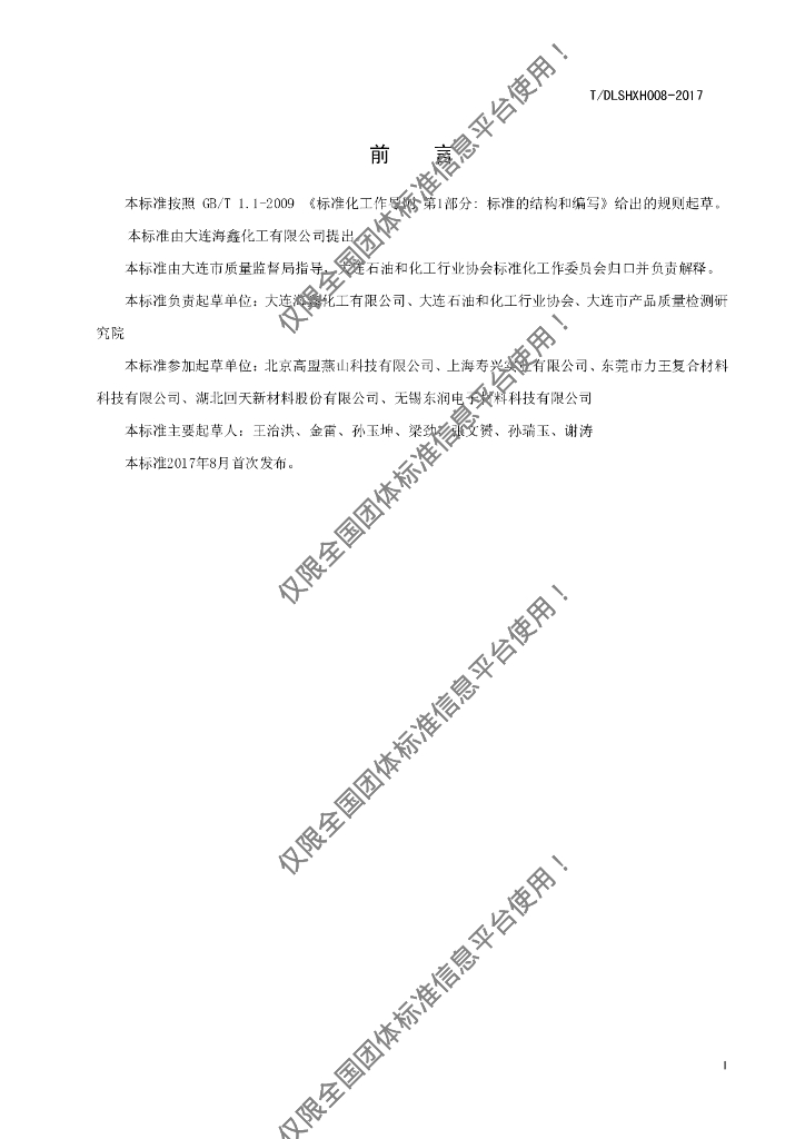 大连海鑫化工有限公司、大连石油和化工行业协会、大连市产品质量检测研究院、北京高盟燕山科技有限公司、上海寿兴实业有限公司、东莞市力王复合材料科技有限公司、湖北回天新材料股份有限公司、无锡东润电子材料科技有限公司