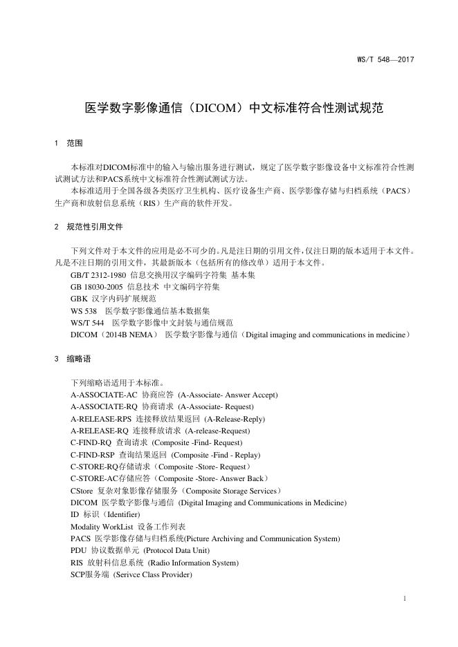 WS/T 548-2017 医学数字影像通信(DICOM)中文标准符合性测试规范