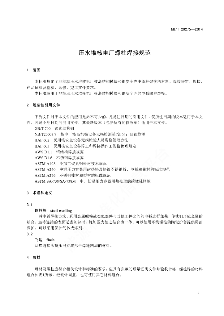 NB/T 20275-2014 压水堆核电厂螺柱焊接规范