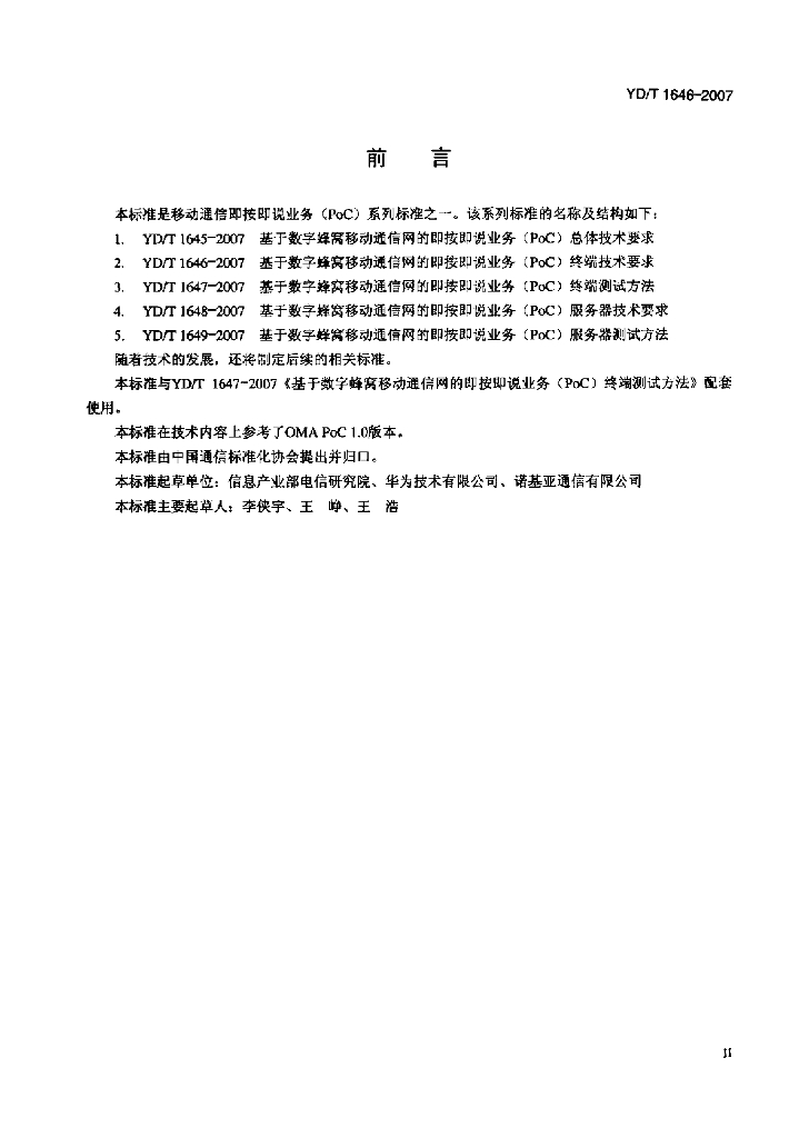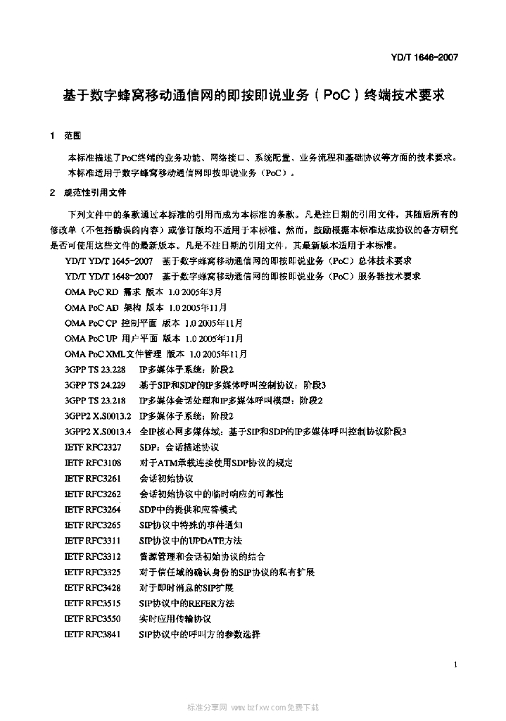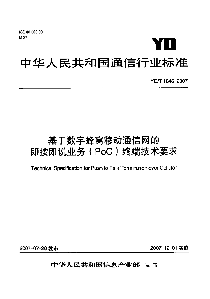 YD/T 1646-2007 基于数字蜂窝移动通信网的即按即说业务(PoC)终端技术要求