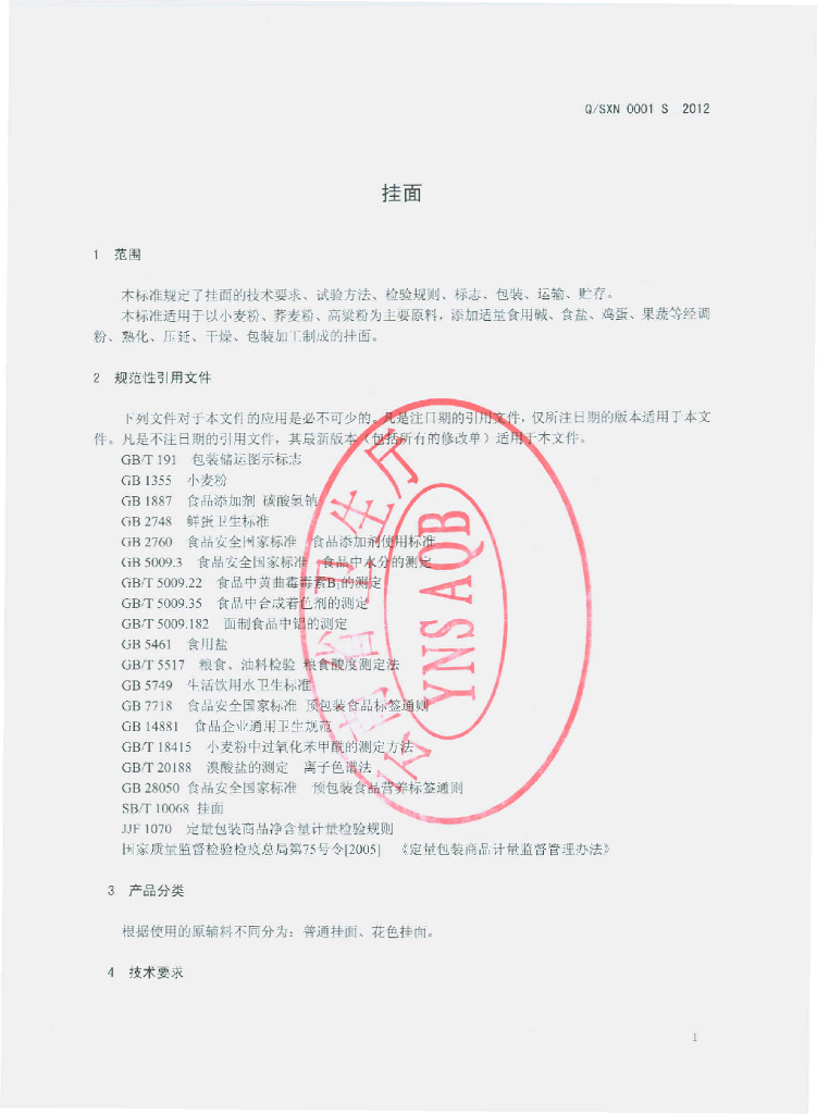 Q/SXN 0001S-2012 挂面