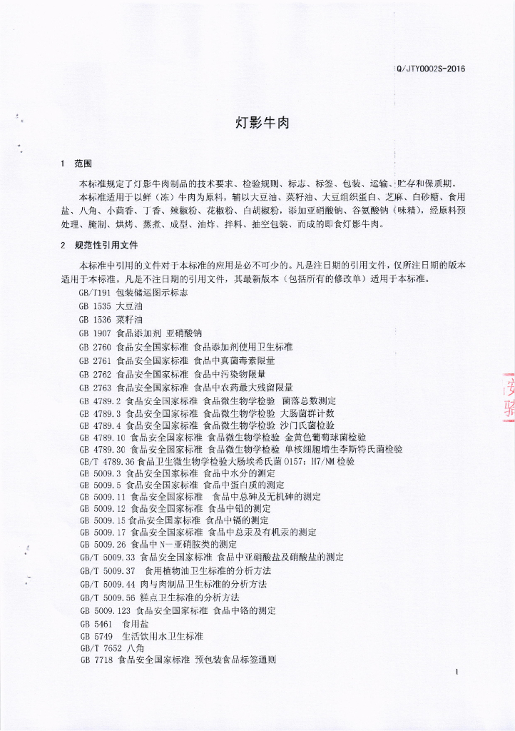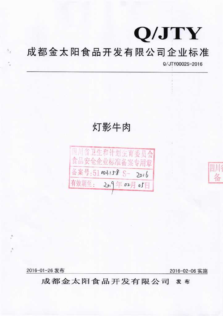 Q/JTY 0002S-2016 成都金太阳食品开发有限公司 灯影牛肉