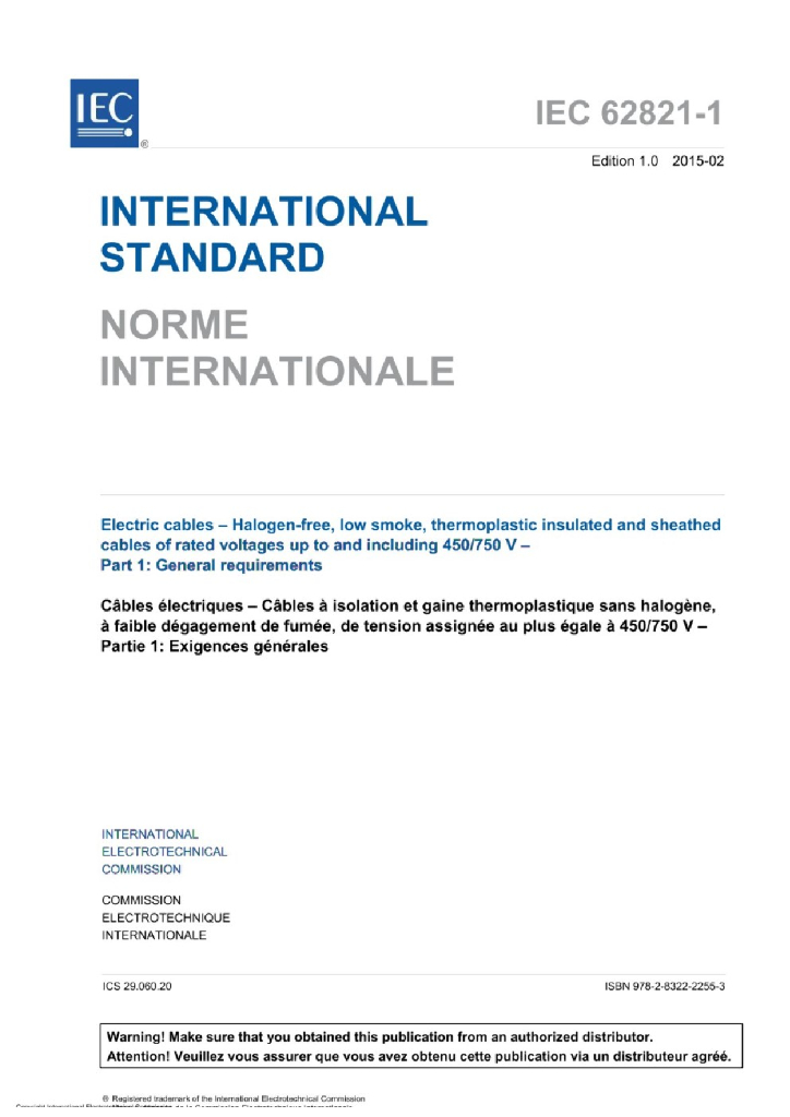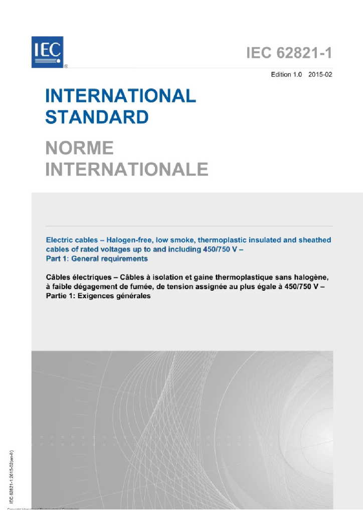 IEC 62821-1:2015 电缆-额定电压450/750V及以下无卤、低烟、热塑性绝缘和护套电缆-第1部分 一般要求