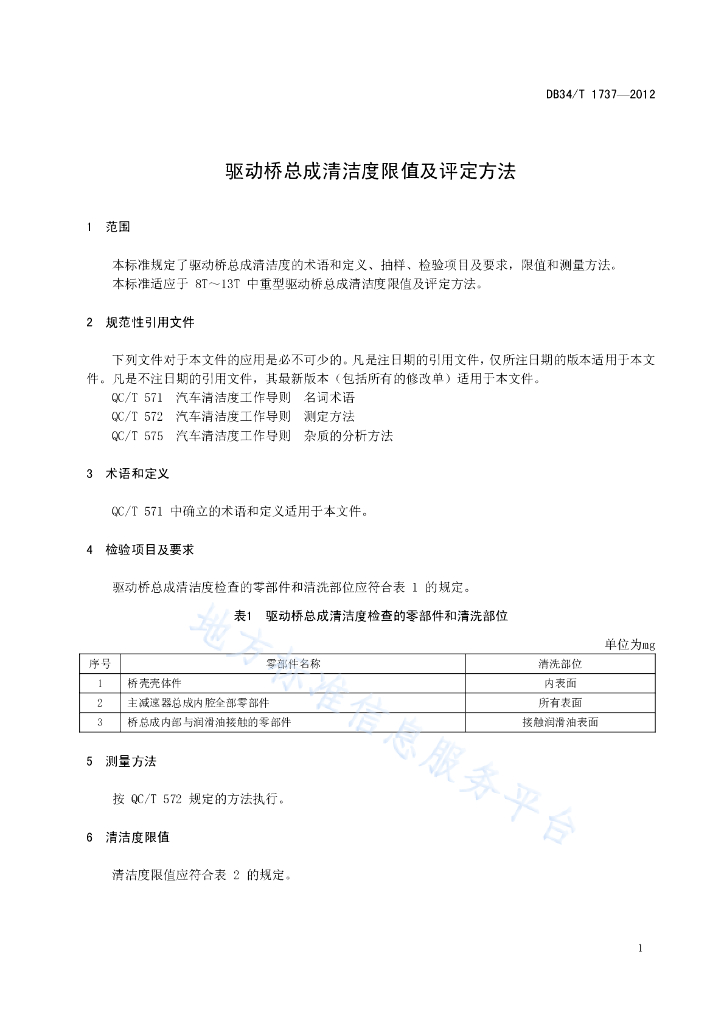 DB34/T 1737-2012 驱动桥总成清洁度限值及评定方法