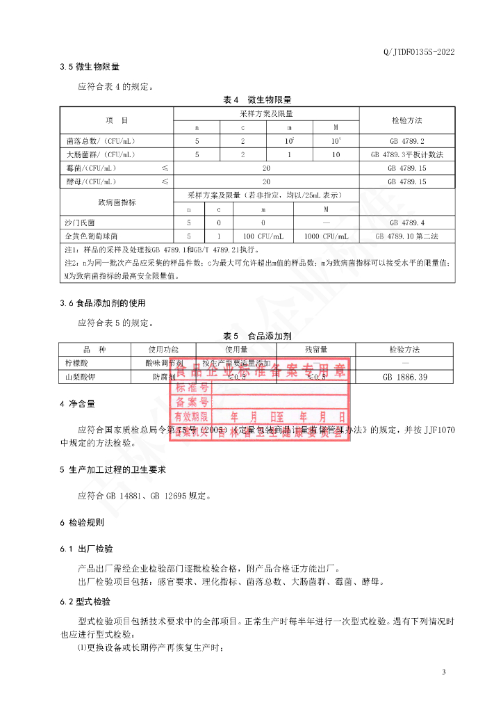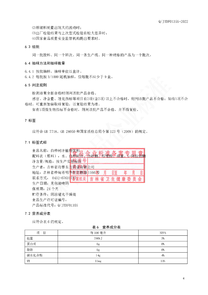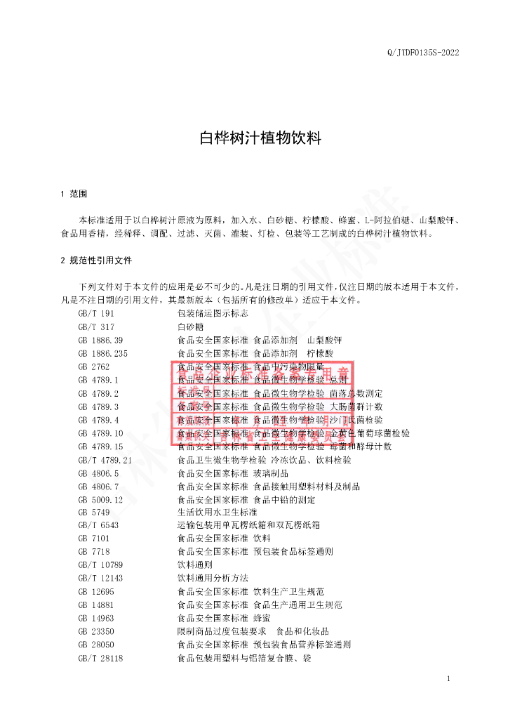 Q/JTDF 0135S-2022 白桦树汁植物饮料