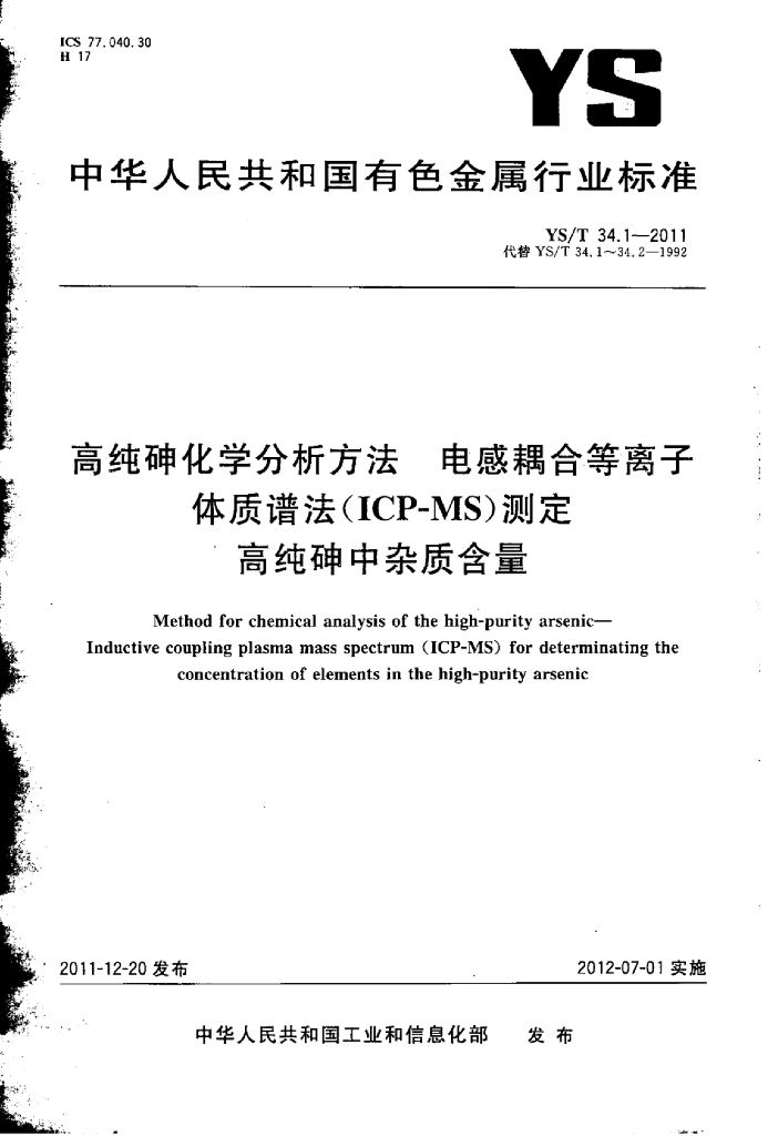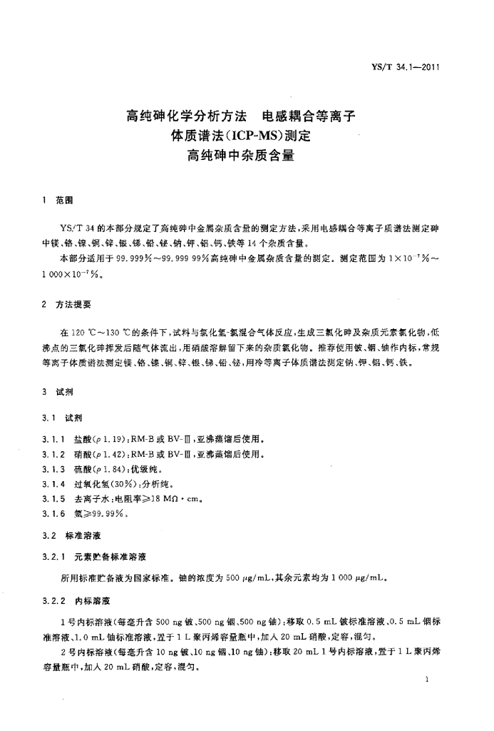 YS/T 34.1-2011 高纯砷化学分析方法电感耦合等离子体质谱法(ICP-MS)测定高纯砷中杂质含量