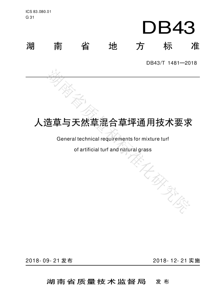 DB43/T 1481-2018 人造草与天然草混合草坪通用技术要求