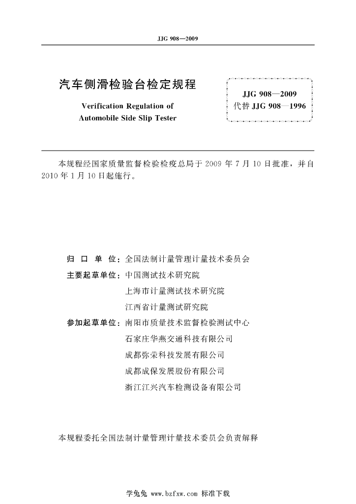 中国测试技术研究院、上海市计量测试技术研究院、江西省计量测试研究院、南阳市质量技术监督检验测试中心、石家庄华燕交通科技有限公司、成都弥荣科技发展有限公司、成都成保发展股份有限公司、浙江江兴汽车检测设备有限公司