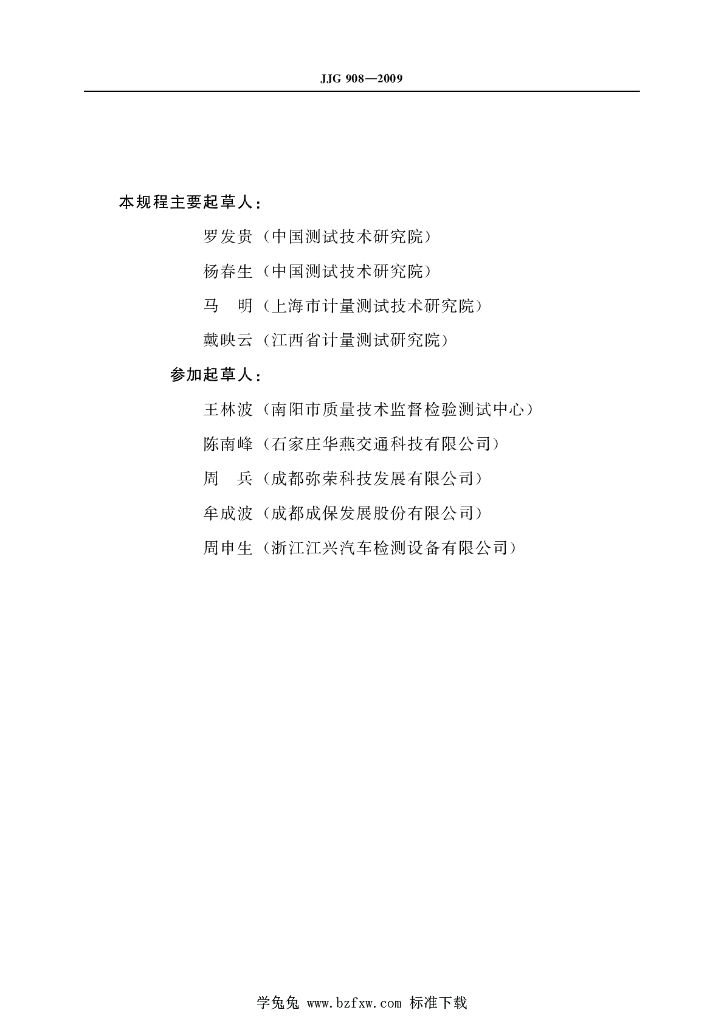 罗发贵(中国测试技术研究院)、杨春生(中国测试技术研究院)、马明(上海市计量测试技术研究院)、戴映云(江西省计量测试研究院)、王林波(南阳市质量技术监督检验测试中心)、陈南峰(石家庄华燕交通科技有限公司)、周兵(成都弥荣科技发展有限公司)、牟成波(成都成保发展股份有限公司)、周申生(浙江江兴汽车检测设备有限公司)