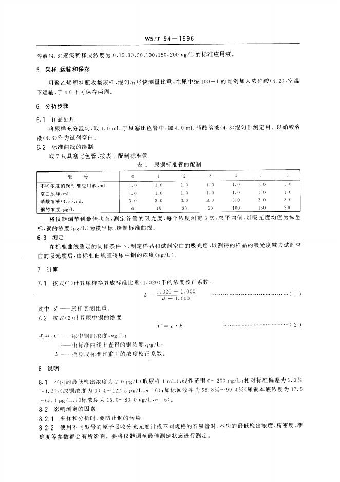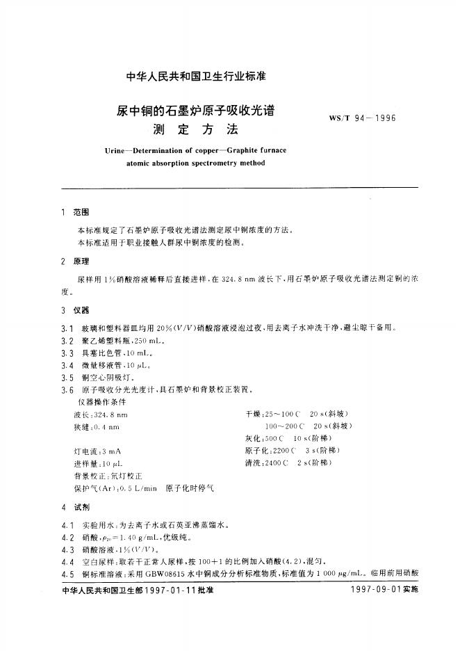 WS/T 94-1996 尿中铜的石墨炉原子吸收光谱测定方法