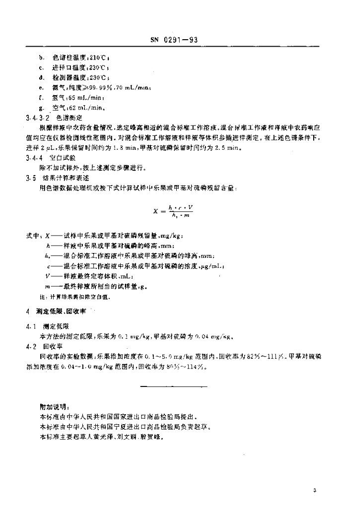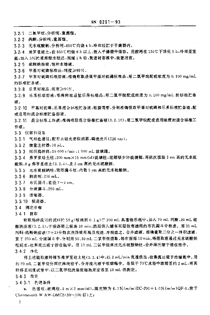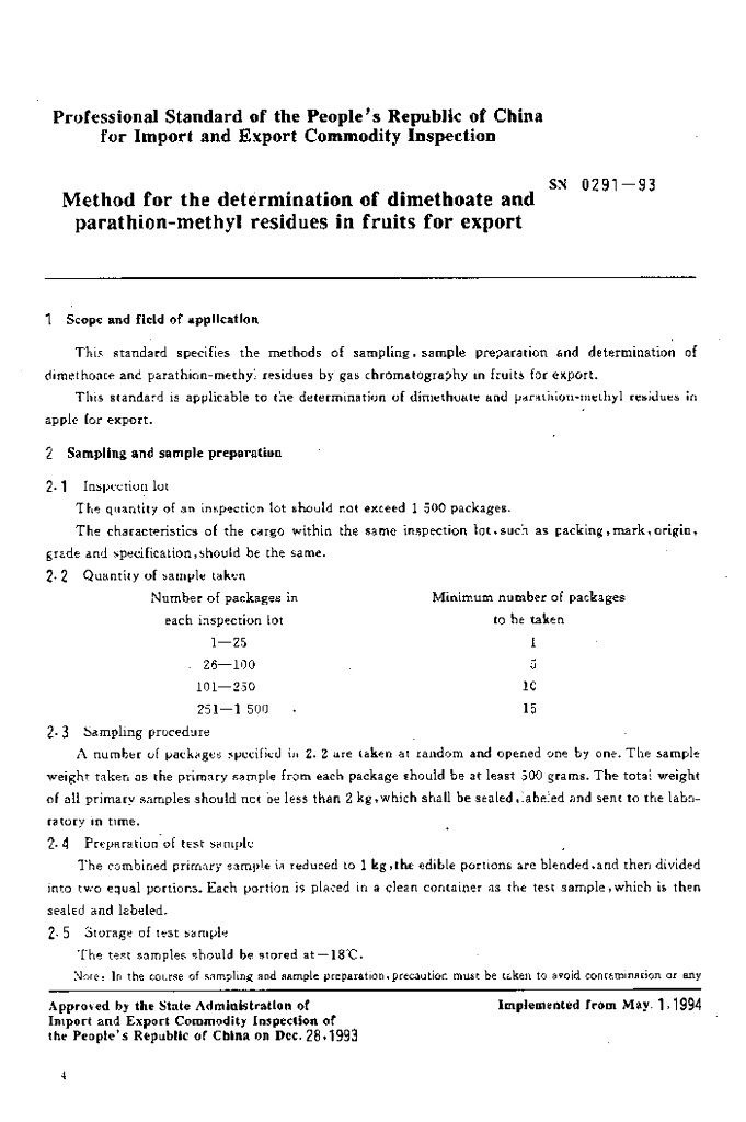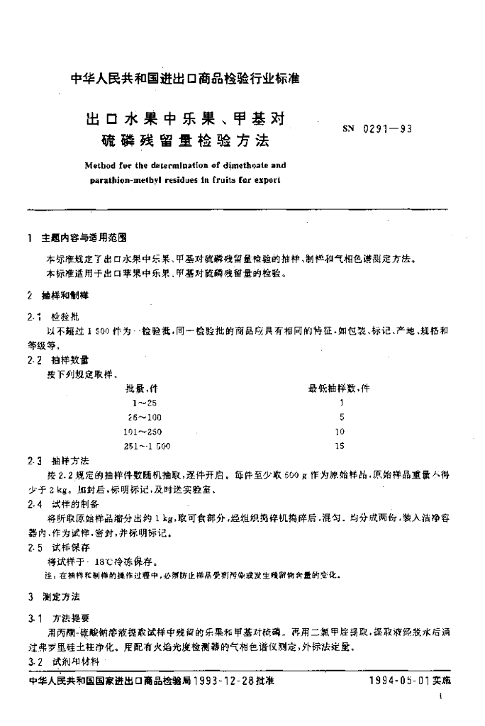 SN 0291-1993 出口水果中乐果、甲基对硫磷残留量检验方法