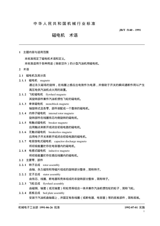 JB/T 5140-1991 磁电机 术语
