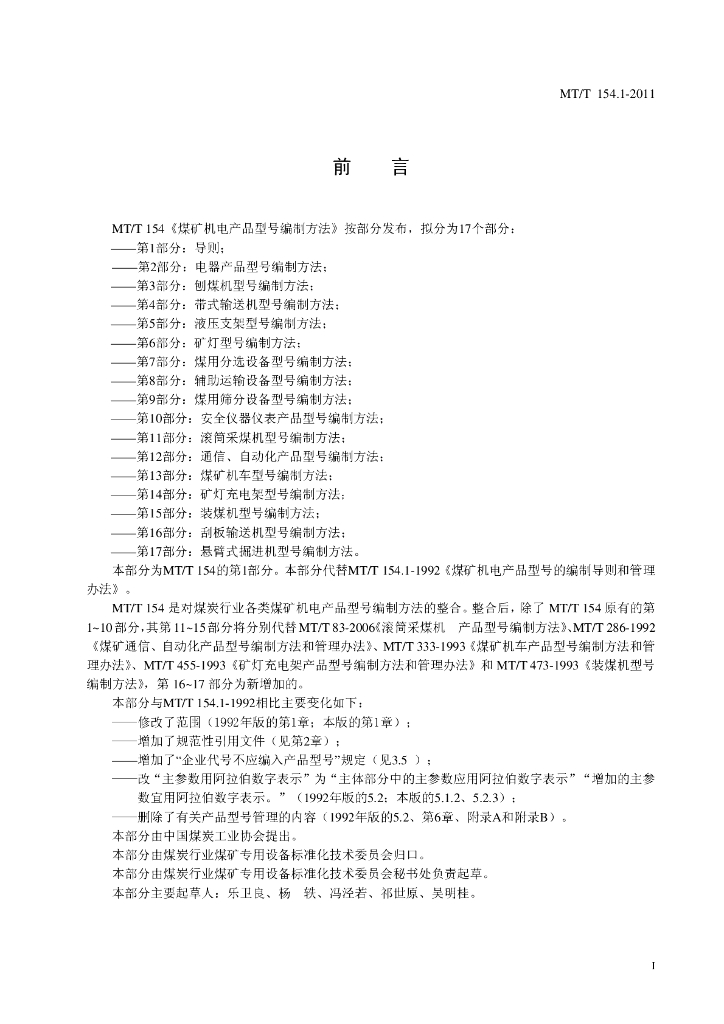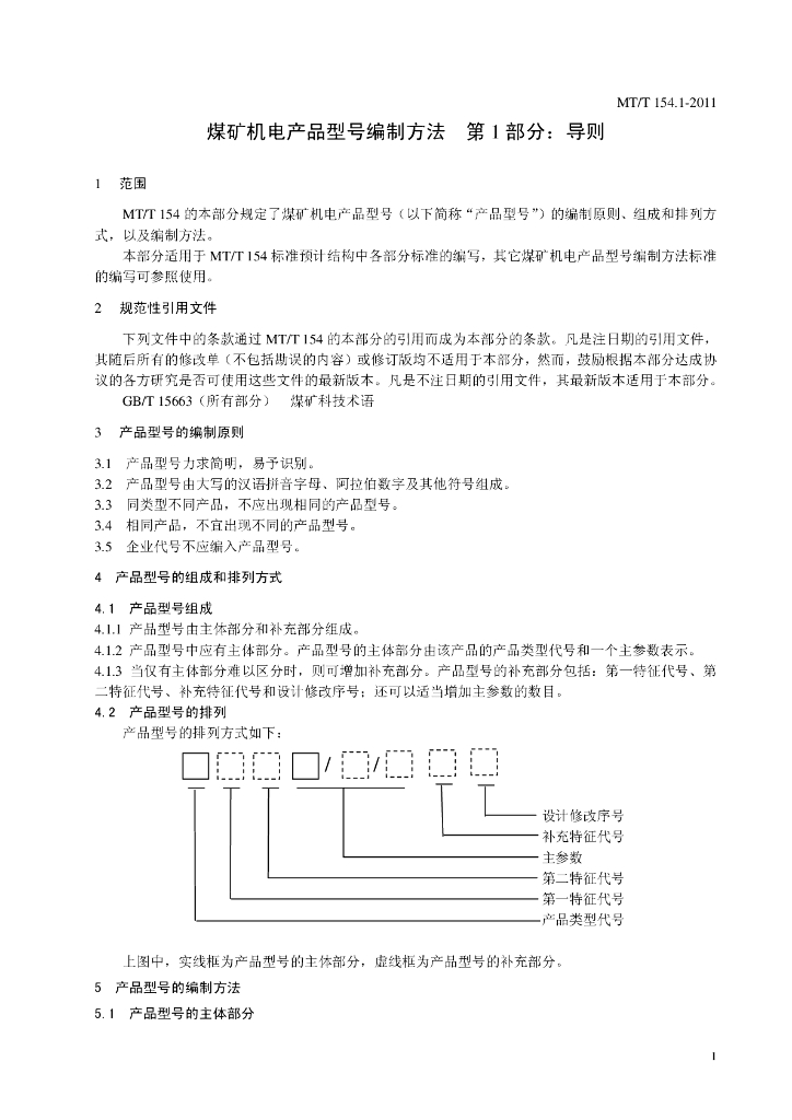 MT/T 154.1-2011 煤矿机电产品型号编制方法
