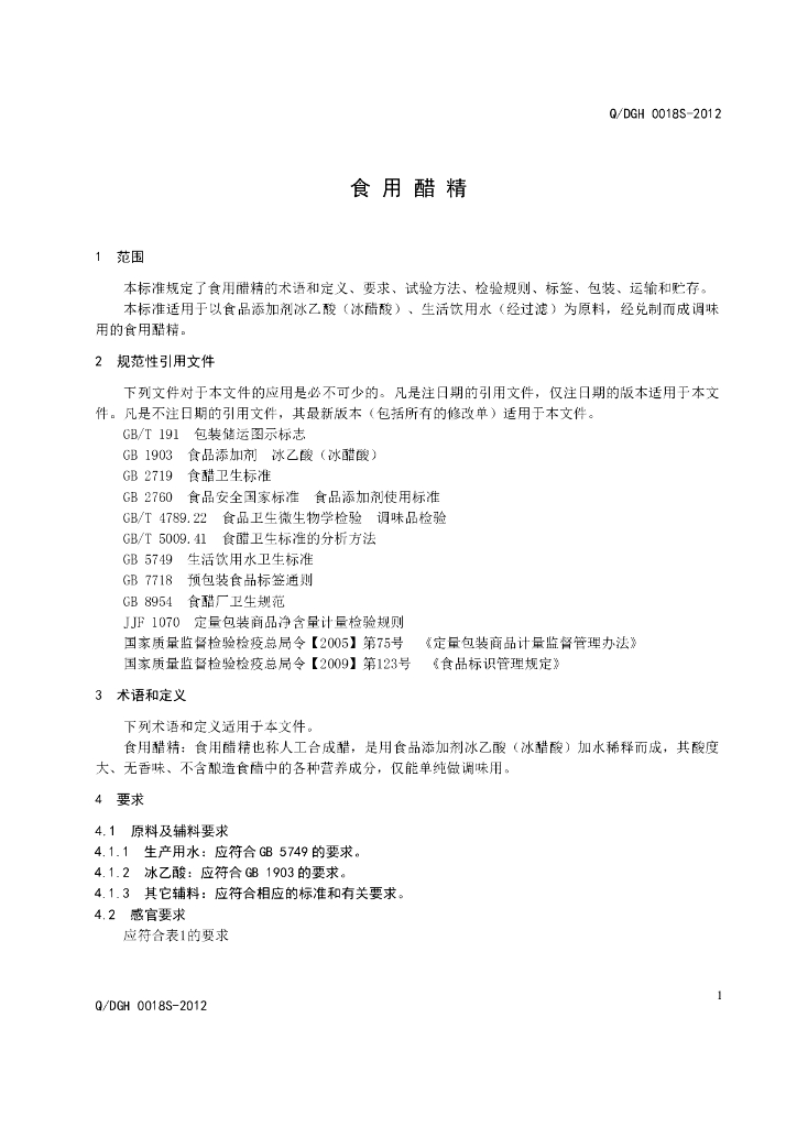 Q/DGH 0018S-2012 食用醋精