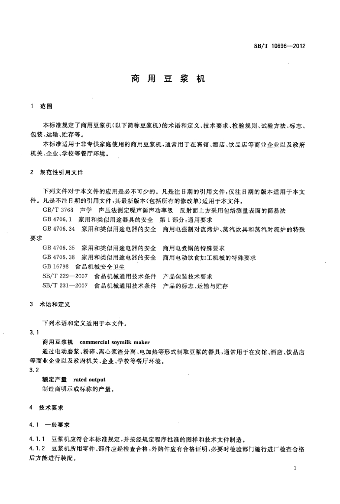 SB/T 10696-2012 商用豆浆机