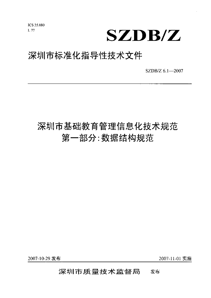 SZDB/Z 6.1-2007 深圳市基础教育管理信息化技术规范(第一部分:数据结构规范)