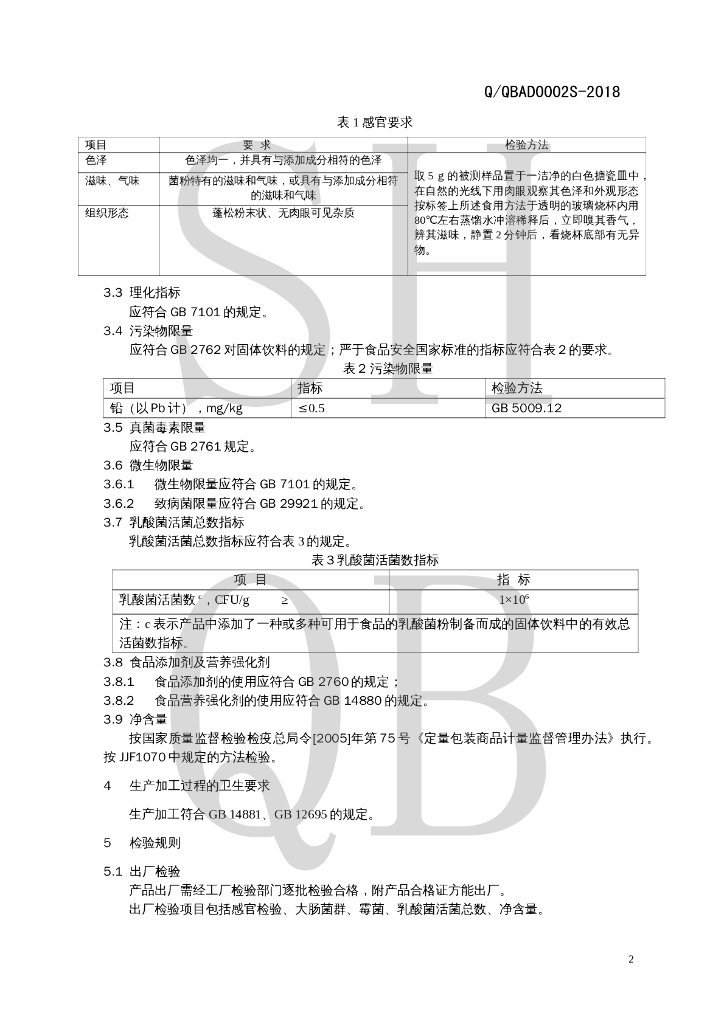 Q/QBAD 0002S-2018 益生菌固体饮料