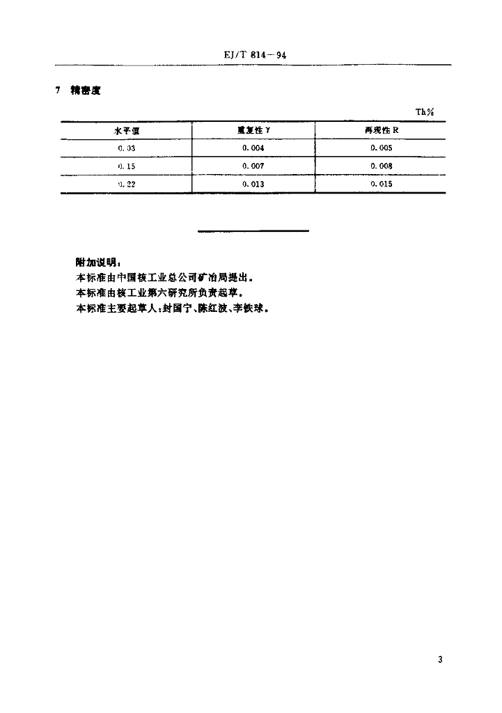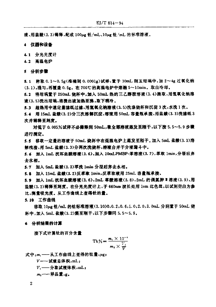 EJ/T 814-1994 铀矿石中钍的测定 PMBP萃取分离偶氮胂Ⅲ分光光度法