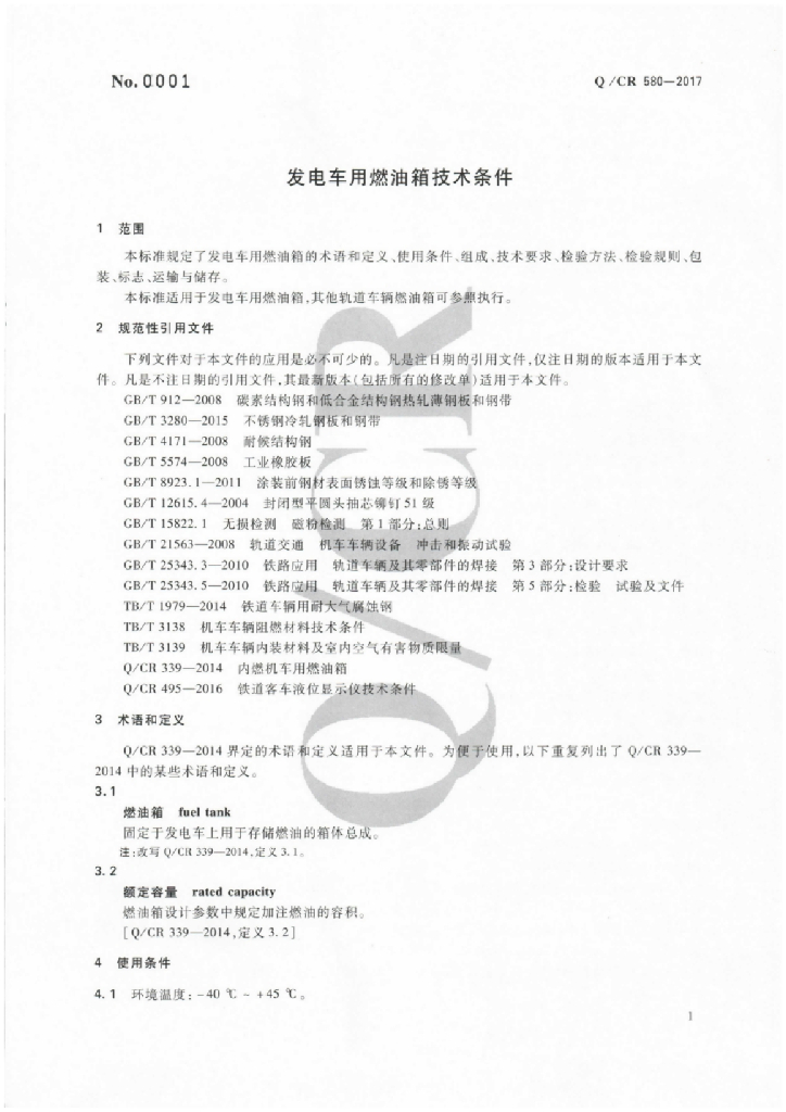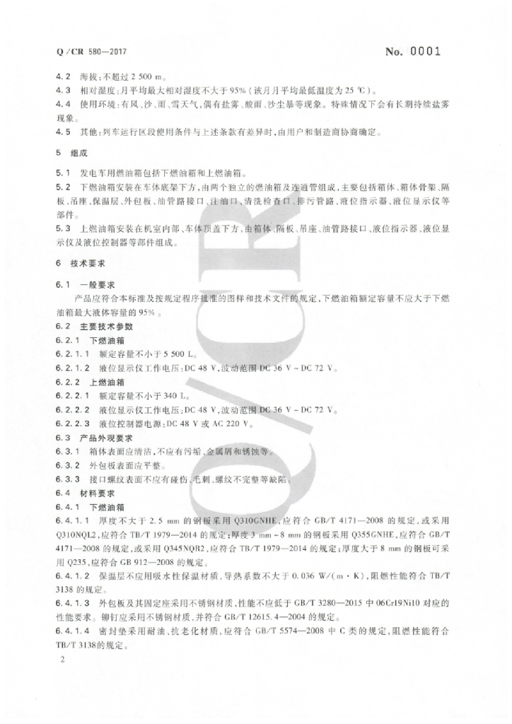 Q/CR 580-2017 发电车用燃油箱技术条件