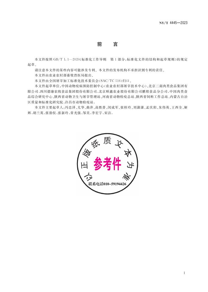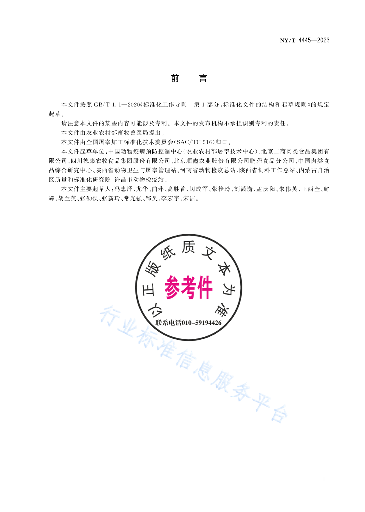 中国动物疫病预防控制中心(农业农村部屠宰技术中心)、北京二商肉类食品集团有限公司、四川德康农牧食品集团股份有限公司、北京顺鑫农业股份有限公司鹏程食品分公司、中国肉类食品综合研究中心、陕西省动物卫生与屠宰管理站、河南省动物检疫总站、陕西省饲料工作总站、内蒙古自治区质量和标准化研究院、许昌市动物检疫站