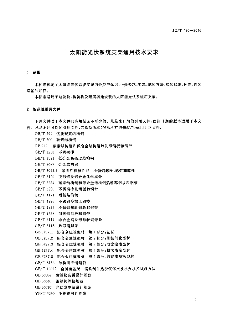 JG/T 490-2016 太阳能光伏系统支架通用技术要求