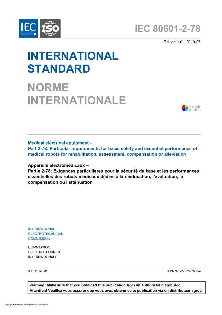 IEC 80601-2-78-2019 医用电气设备 第2-78部分:康复、评估、补偿或缓解医疗机器人基本安全和基本性能的特殊要求