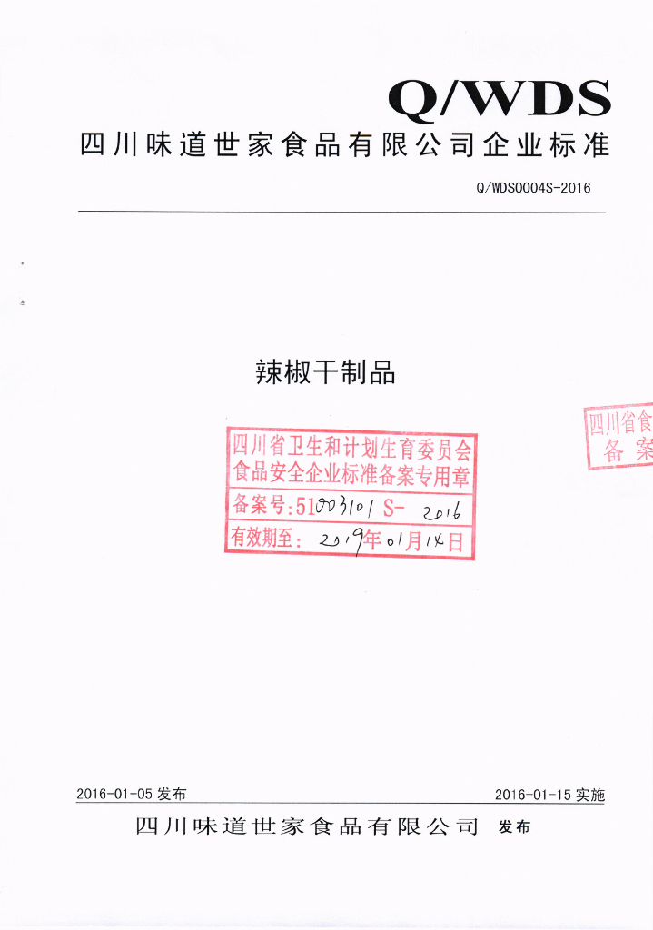 Q/WDS 0004S-2016 四川味道世家食品有限公司 辣椒干制品