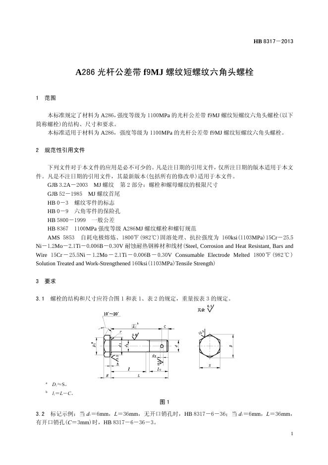 HB 8317-2013(2017) A286光杆公差带F9MJ螺纹短螺纹六角头螺栓