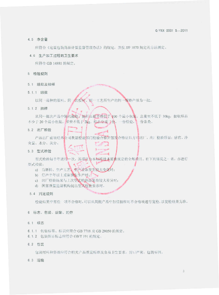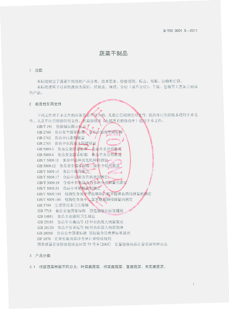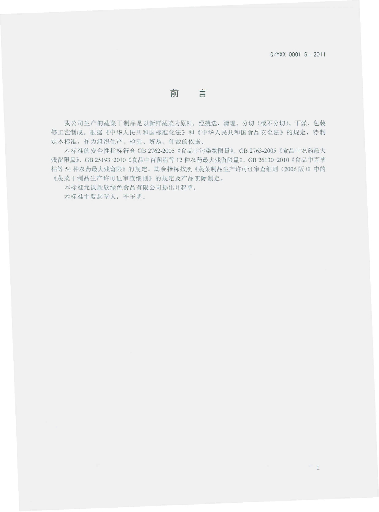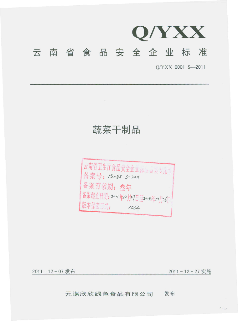 Q/YXX 0001S-2011 蔬菜干制品
