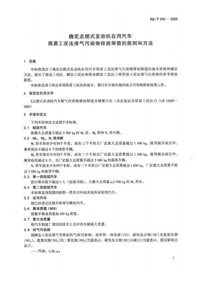 HJ/T 240-2005 确定点燃式发动机在用汽车简易工况法排气污染物排放限值的原则和方法