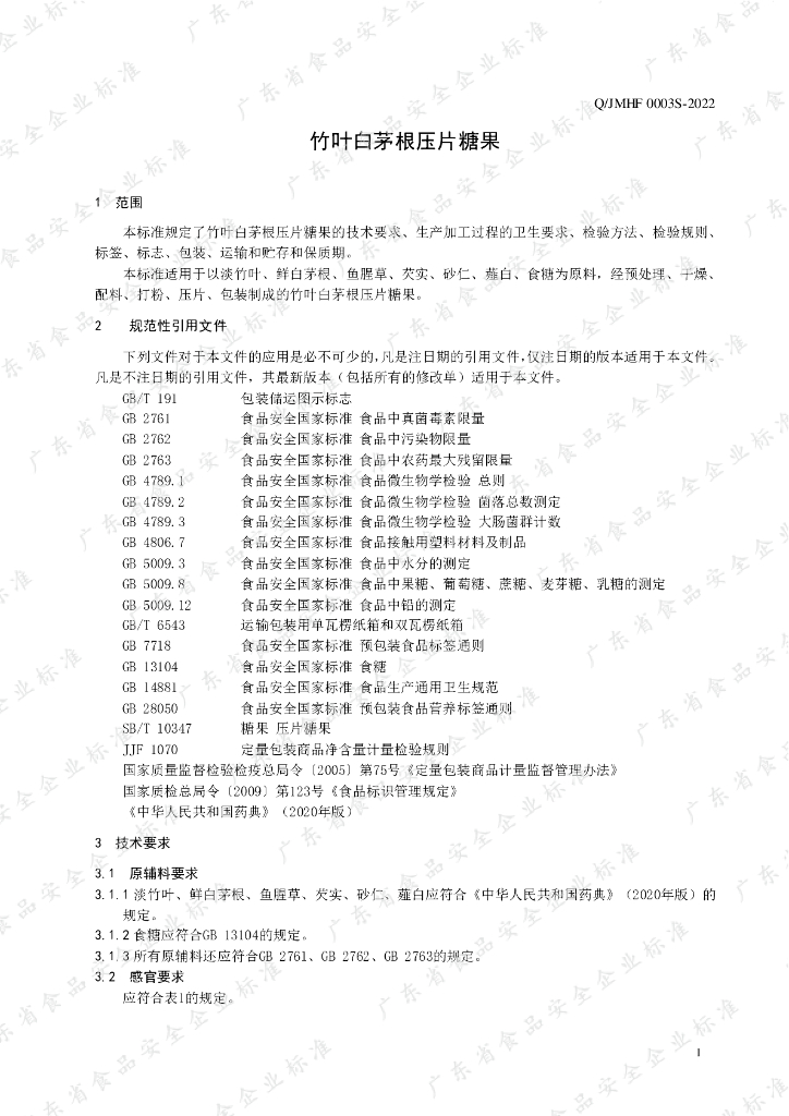 Q/JMHF 0003S-2022 竹叶白茅根压片糖果