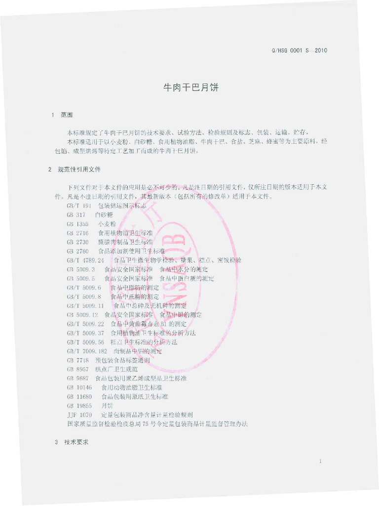 Q/HSG 0001S-2010 牛肉干巴月饼